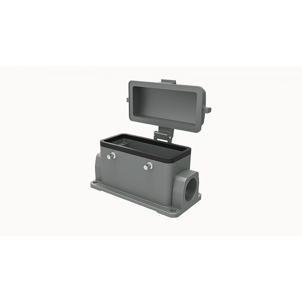 Основание разъема на панель, закрытое, типоразмер 16B, с уплотнителем, 1 отверстие с резьбой для кабельных вводов M25x1,5, с левым расположением, без защелок (упоры для двух защелок), с защитной крышкой, материал корпуса: алюминиевый сплав