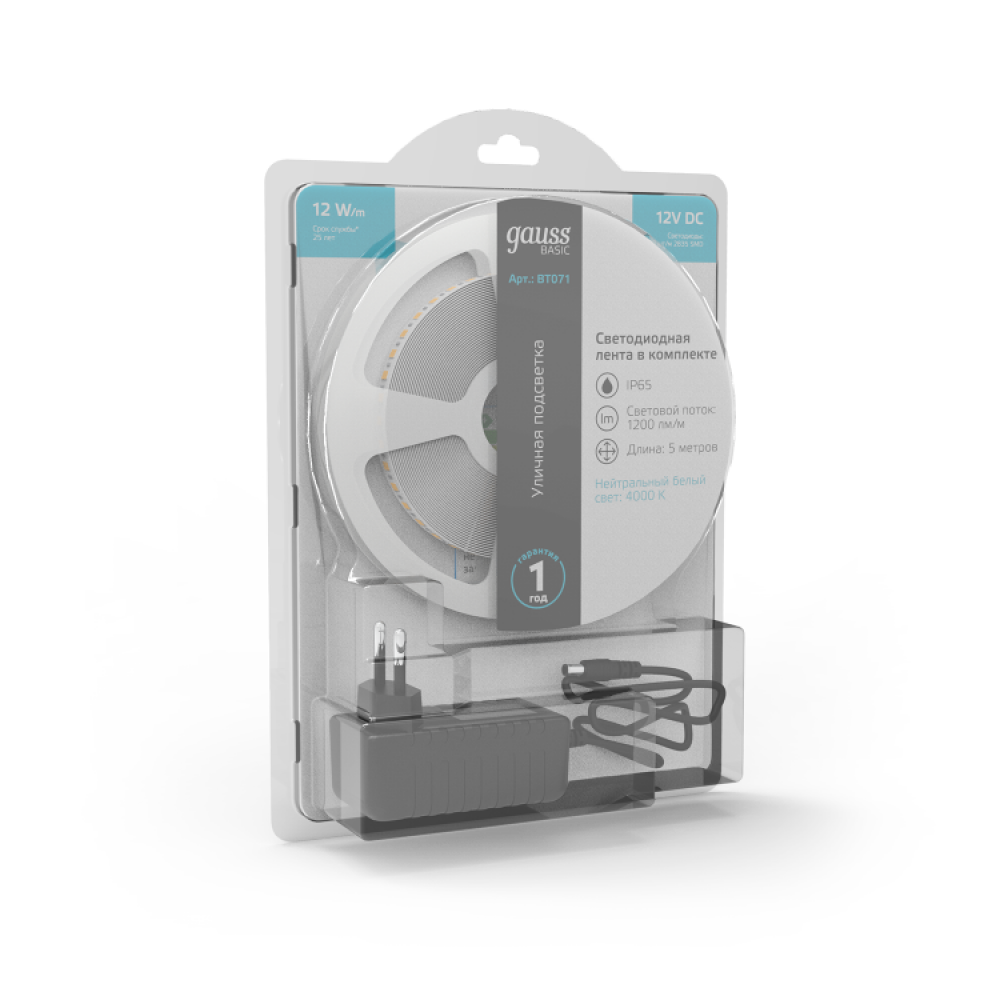 Лента Basic в комплекте LED 2835/120 12V 12W/m 1200lm/m 4000K 8mm IP65 5m 1/50 BT071, Лента светодиодная одноцветная белая