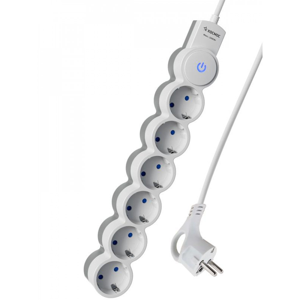 Удлинитель 6х5м ПВС 3х0.75 с защ. шторк. с заземл. IP20 с выкл. 220В 10А 2200Вт бел. YKsm5m-6g-Z-V10A-W, Удлинитель, сетевой фильтр