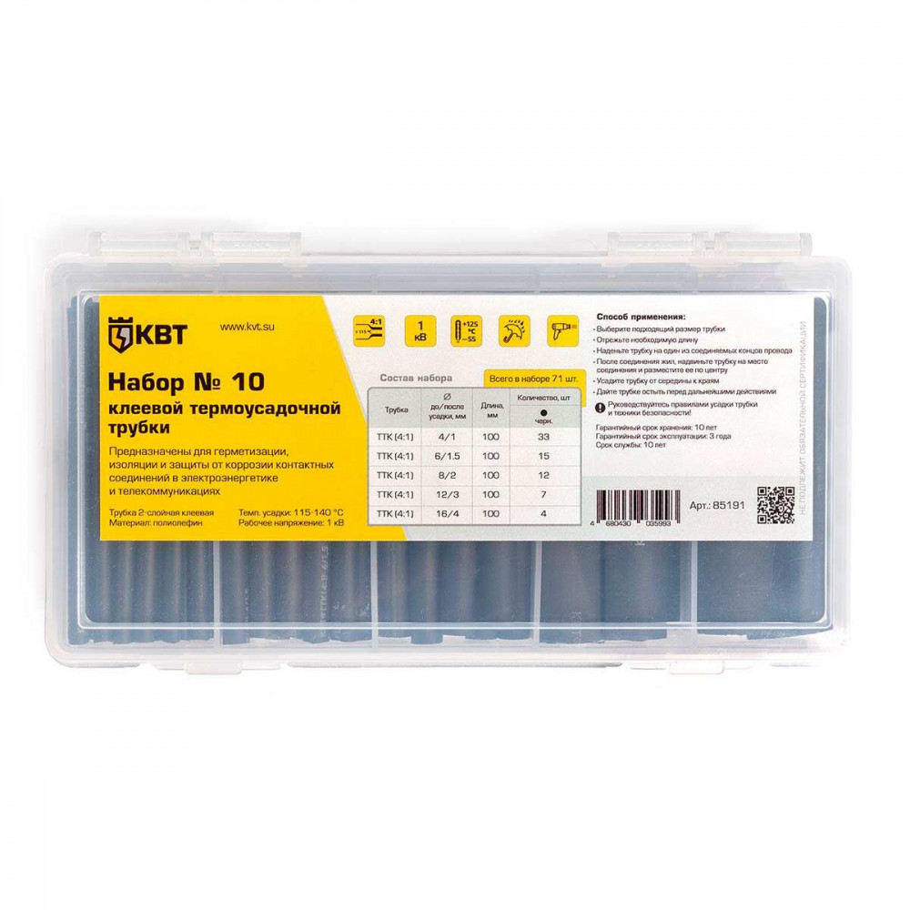 Набор термоусадочных трубок №10, коэф.усадки 4:1, на клеевой основе. В комплекте 5 типоразмеров по 100мм: 4/1-33шт, 6/1.5-15шт, 8/2-12шт, 12/3-7шт, 16/4-4шт.