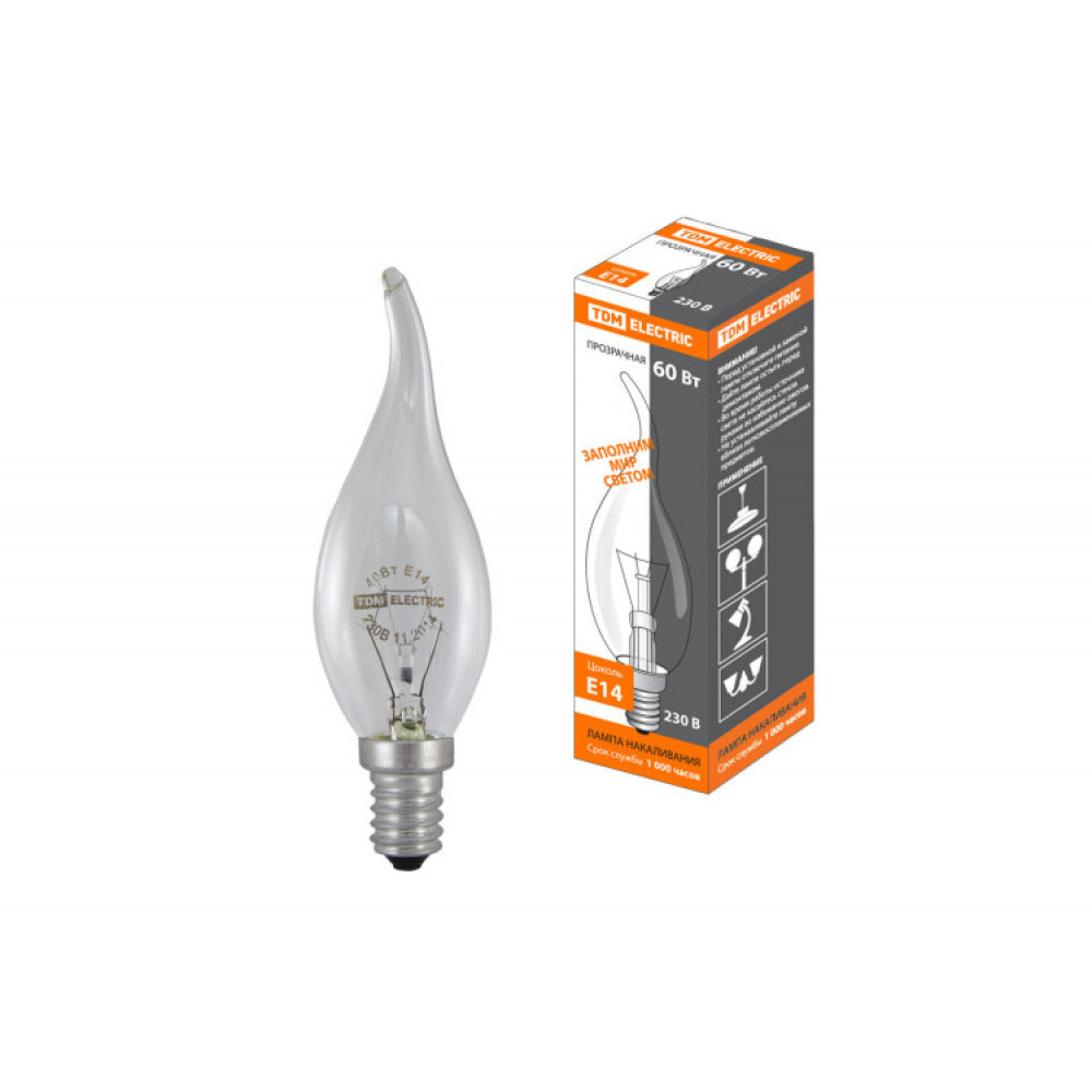 Лампа накаливания "Свеча на ветру" прозрачная 60 Вт-230 В-Е14 SQ0332-0016, Лампа накаливания