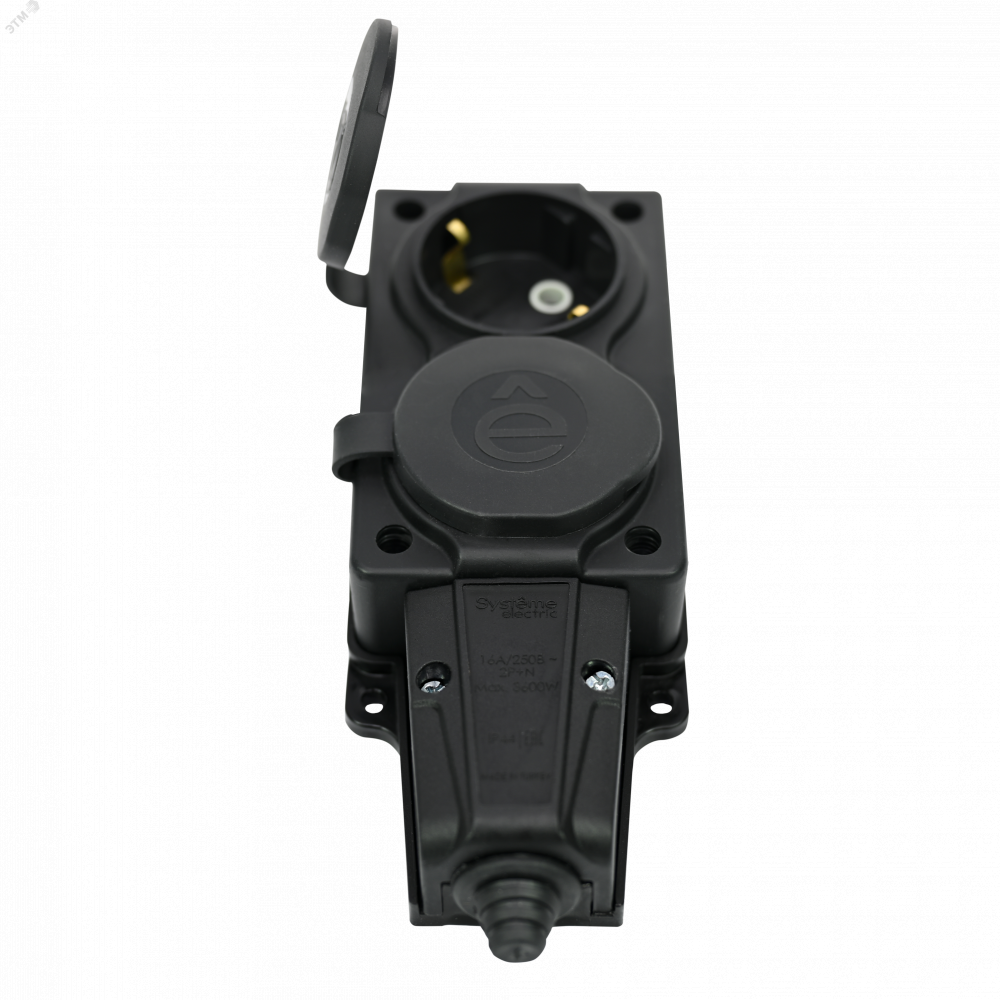 Описание Колодка MultiSet 2х розетка 2К+З 16А/250В IP44 каучуковая черн. SE MST4102BK