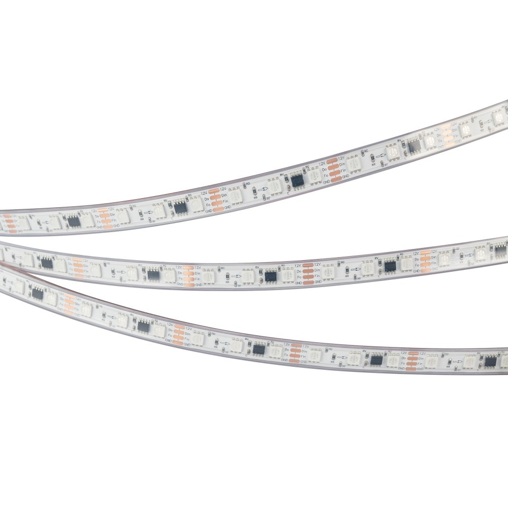 Светодиодная лента SPI-PS-B60, герметичная IP67 (PS - силиконовая экструзия), с микросхемой MT16703. Светодиоды 5060, 60 шт/м (1 pixel = 3 LED), обход битого пикселя - BPT, белая плата, скотч 3М. Цвет RGB, угол 120°. Питание 12 В, мощность 12 Вт/м (60 Вт