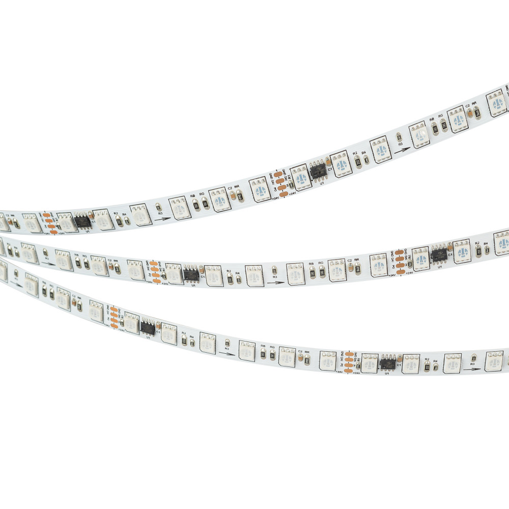 Светодиодная лента DMX-B72, открытая IP20, микросхема UCS512. Светодиоды SMD 5060, 72шт/м (360шт на 5 м), 1 pixel = 6 LED, белая плата, ширина 10мм, скотч 3М. Цвет RGB, угол 120°. Питание 24 В, мощность 16 Вт/м (80 Вт на 5 м). Размеры 5000x10x2 мм. Мин.от