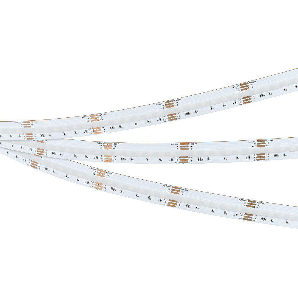Лента COB сплошной засветки без видимых светодиодов, открытая IP20. Светодиоды CSP, 840 шт/м (4200 шт на 5 м), белая плата, скотч 3M. Цвет RGB+MIX ТЕПЛЫЙ 2700K/БЕЛЫЙ 6000K, индекс цветопередачи CRI>90 , угол 160°. Питание 24V, мощность 16 Вт/м (80 Вт на 5