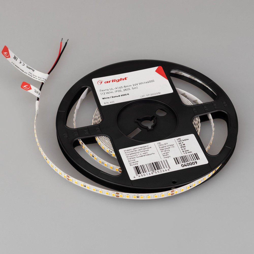 Описание Лента UL-A160-8mm 24V White6000 (12 W/m, IP20, 2835, 5m) 040009
