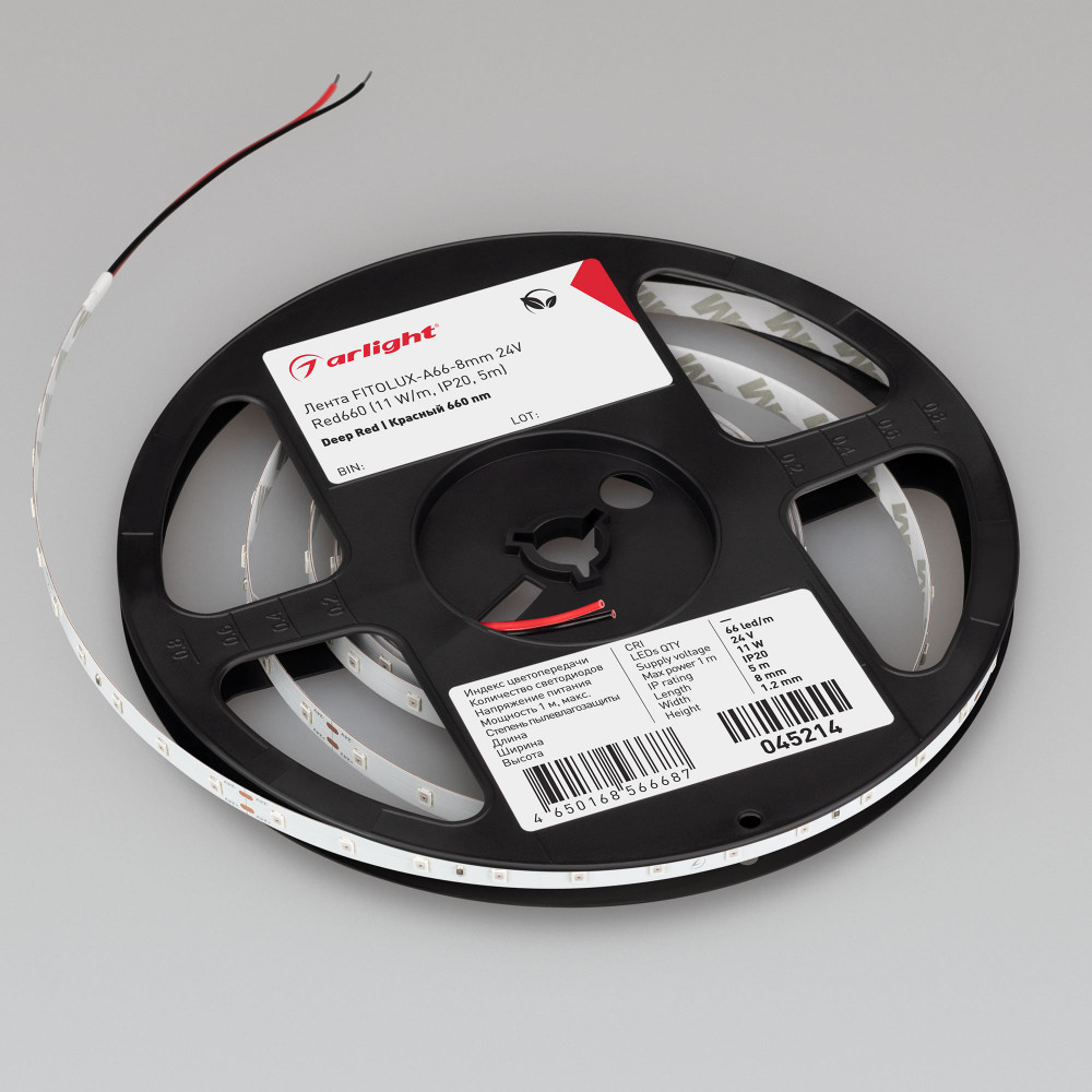 Светодиодная лента FITOLUX-A66, открытая, для досветки растений. Светодиоды smd 2835, 66 шт/м (330шт на 5м), белая плата 8 мм, скотч 3М. Цвет Красный 660 нм. Питание 24V, мощность 11 Вт/м (55 Вт на 5м), угол 120°. Размеры 5000х8x1.2 мм. Мин.отрезок 167 мм