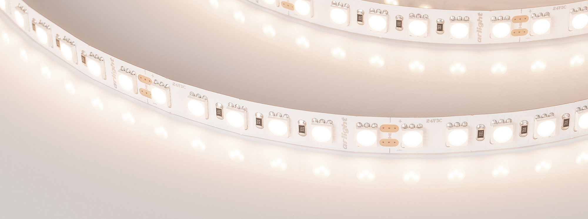 Светодиодная лента RT-B96, открытая. Светодиоды 5060, 96 шт/м (480 шт на 5 м), белая плата, ширина 10 мм, скотч 3M. Цвет ТЁПЛЫЙ 3500 K, цветопередача CRI>90, угол 120°. Питание 24V, мощность 23 Вт/м (115 Вт на 5 м). Размеры 5000x10x2.2 мм. Мин.отрезок 62.