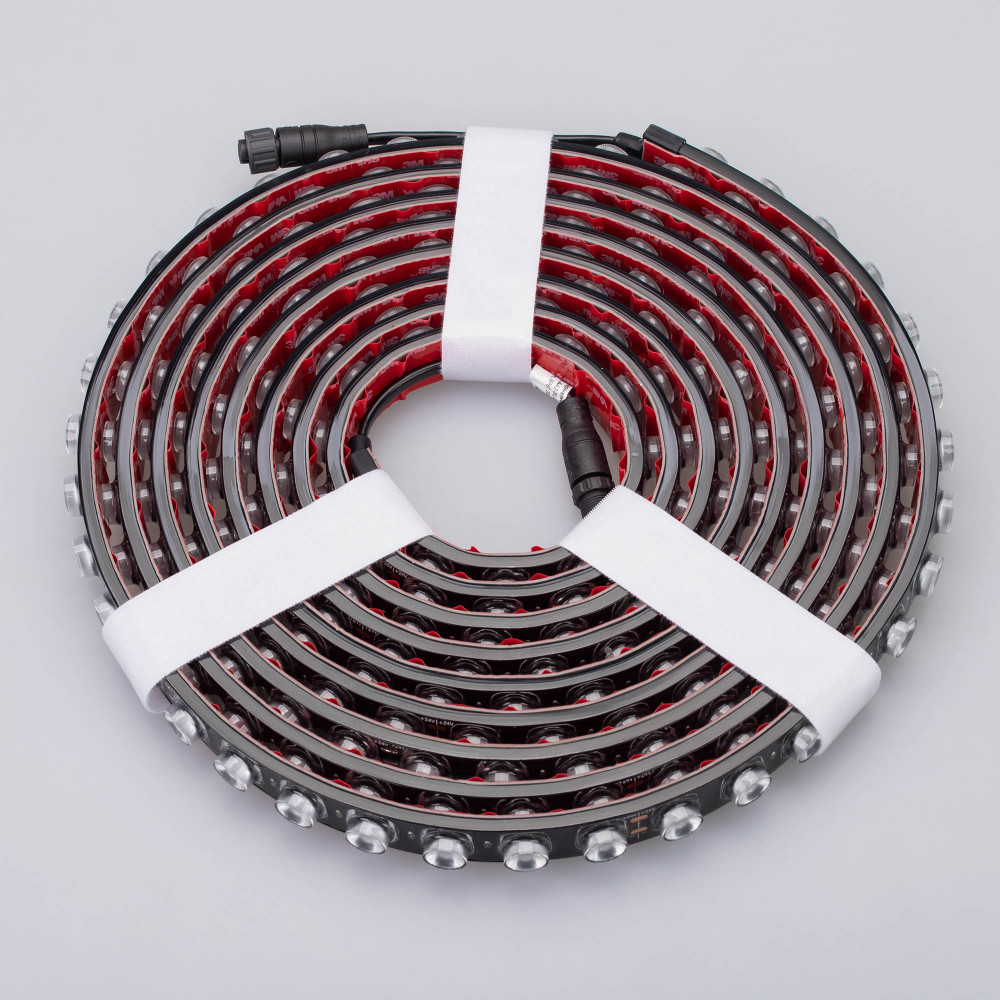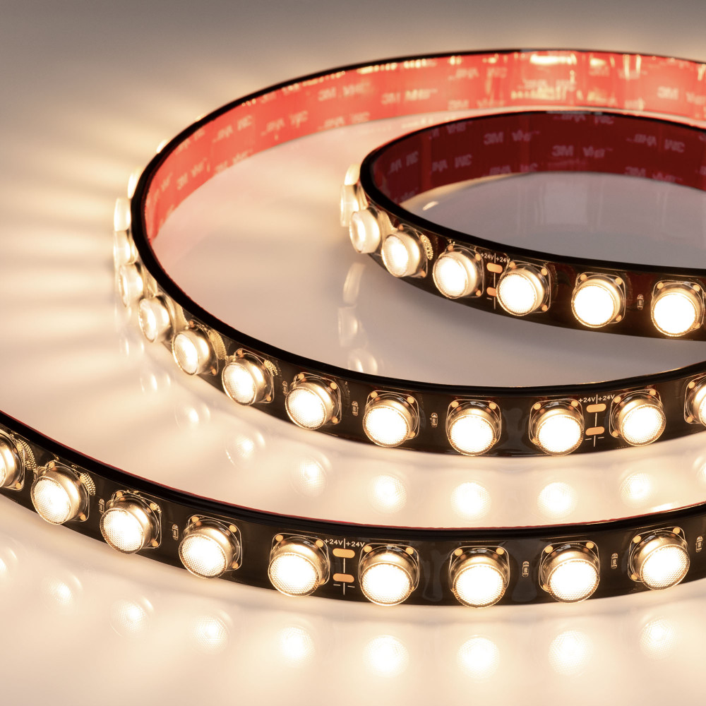 Светодиодная гибкая лента Wall Washer, герметичная IP67. Светодиоды 2835, 42 шт/м (210 шт на 5м), черная плата, скотч 3М. Цвет свечения ТЕПЛЫЙ 3000К, направленная линза с углом 30°, индекс цветопередачи CRI>80. Питание 24 В, мощность 21 Вт/м (105 Вт на 5