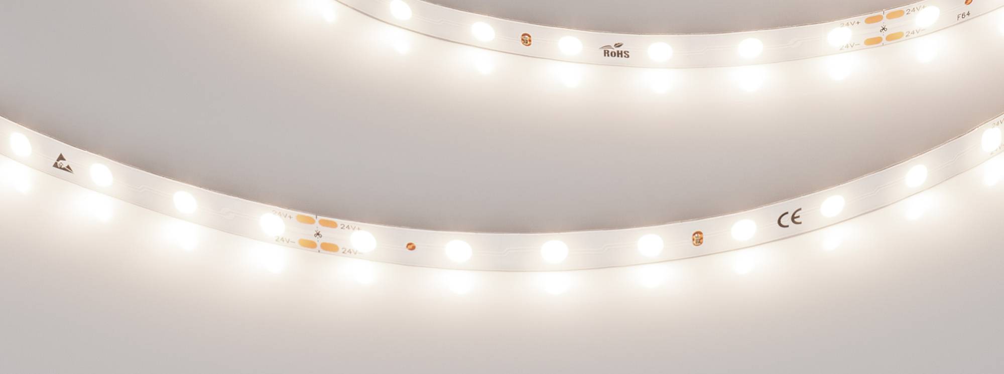 Лента DOT с видимой световой точкой. Светодиод Point Light, 64 шт/м (320 шт на 5 м), белая плата, ширина 8 мм, скотч 3M. Цвет ДНЕВНОЙ 4000 K, цветопередача CRI>80, угол 145°. Питание 24 В, мощность 5 Вт/м (25 Вт на 5 м). Размеры 5000x8x1.2 мм. Мин. отрезо