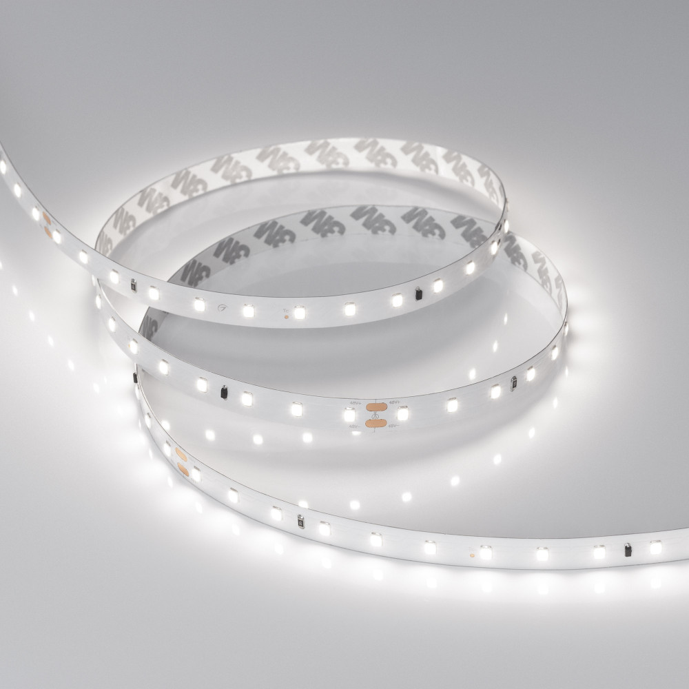Стабилизированная светодиодная лента длиной 60м с подключением с одной стороны IC-A72, открытая. Светодиоды 2835, 72 шт/м (4320 шт на 60 м), белая плата, ширина 10 мм, скотч 3M. Цвет БЕЛЫЙ 6000К, цветопередача CRI>85, угол 120°. Питание 48 В, мощность 3.8