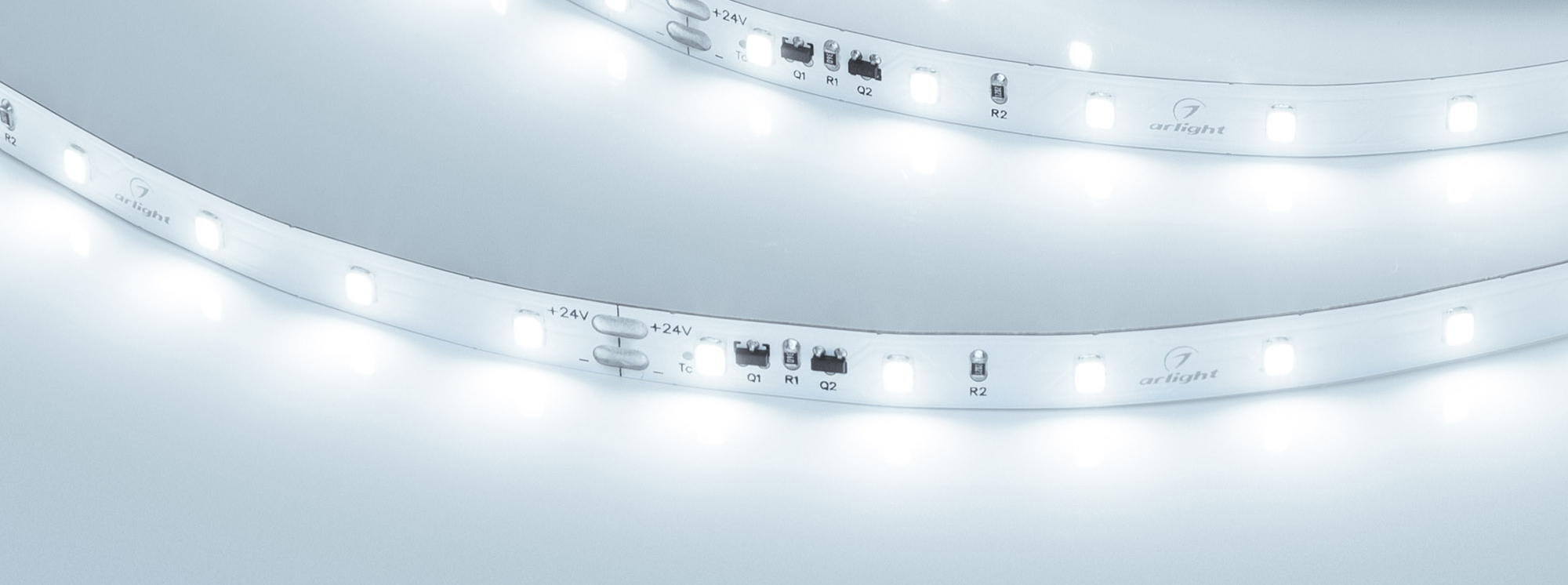 Лента IC-A60-8mm 24V Cool 8K (4.8 W/m, IP20, 2835, 10m) 040604, Стабилизированная лента 10 метров, светодиоды smd 3528, 60шт/м (600шт на 10м), белая плата 8мм, скотч 3М. Цвет ХОЛОДНЫЙ 8000K. Питание 24V, мощность 4.8 Вт/м (48 Вт на 10м), угол 120°, цветопередача CRI>80. Размеры 10000х8x2.2мм. Мин.отрезок 100мм, 6 шт с