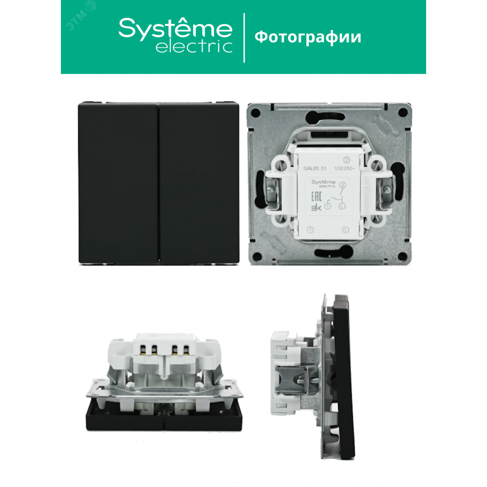 Механизм выключателя 2-клавишного Systeme Electric серии ArtGallery в цвете карбон подходит для сетей 250 В, на ток 10 А.