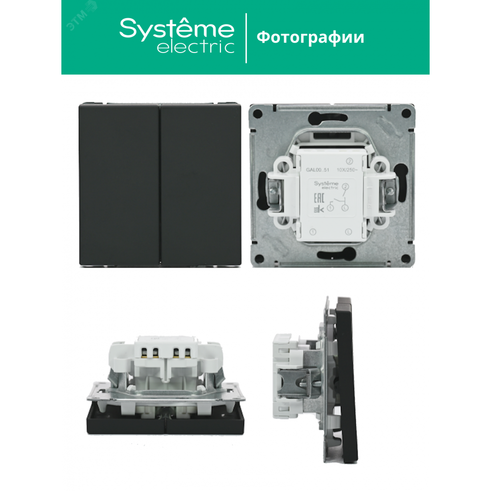 Механизм выключателя 2-клавишного Systeme Electric серии ArtGallery в цвете базальт подходит для сетей 250 В, на ток 10 А.