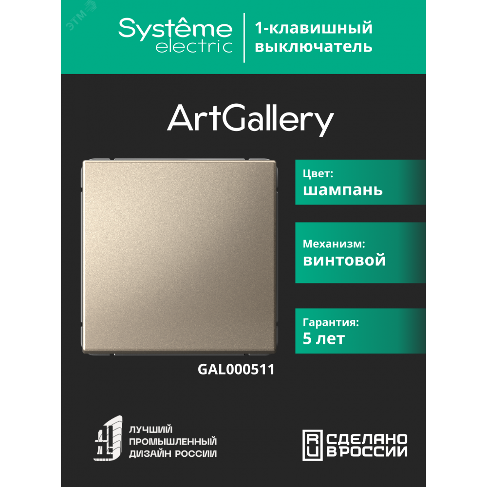 Механизм Systeme Electric серии ArtGallery в цвете шампань выключателя 1-клавишного подходит для сетей 250 В, на ток 10 А.