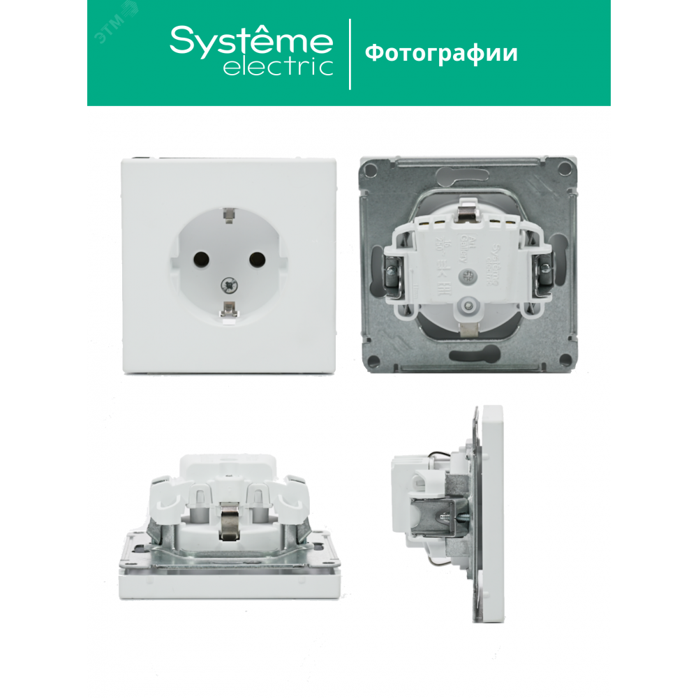 Механизм Systeme Electric серии ArtGallery в цвете белый розетки одинарной с заземлением и без шторок подходит для сетей 250 В, на ток 16 А.