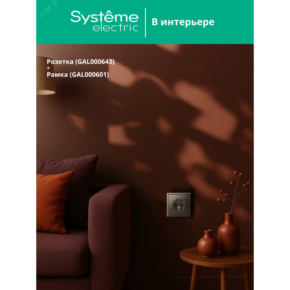 Механизм Systeme Electric серии ArtGallery в цвете мокко розетки одинарной с заземлением и без шторок подходит для сетей 250 В, на ток 16 А.