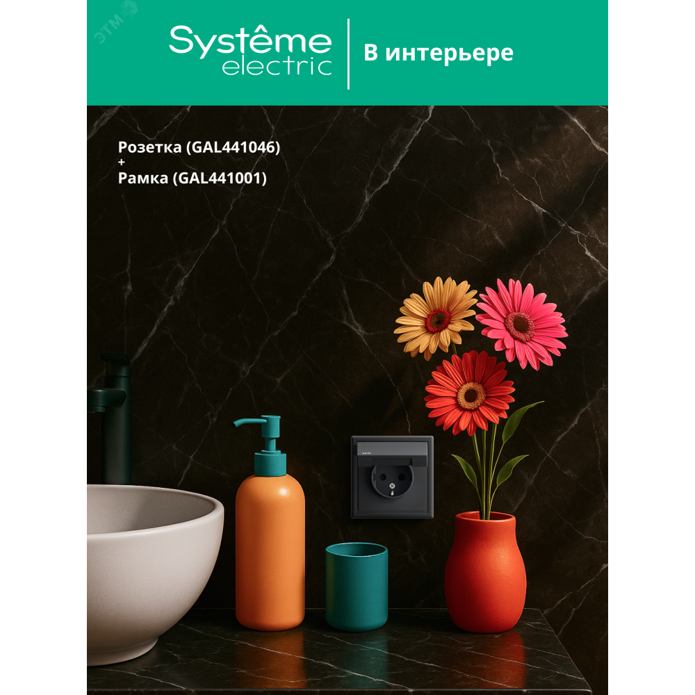 Механизм Systeme Electric серии ArtGallery Aqua в цвете карбон розетки одинарной с заземлением, шторками и крышкой подходит для сетей 250 В, на ток 16 А.