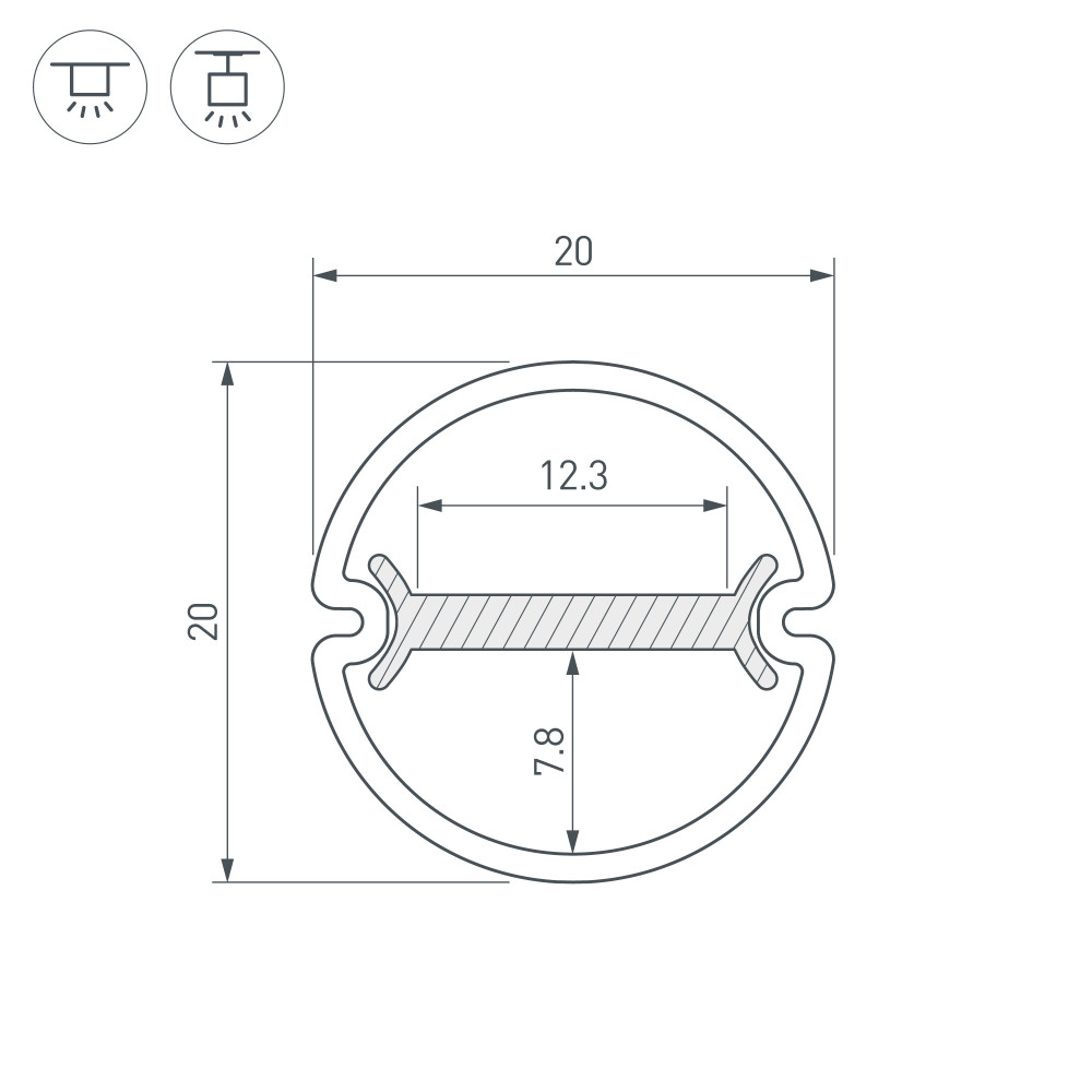 Алюминиевый анодированный двухсторонний круглый профиль для светодиодных лент и линеек. Габаритные размеры профиля (LхWхH): 2000x15x5 мм. Габаритные размеры профиля с экраном (L?D): 2000xD20 мм. Ширина площадки для ленты 12,3 мм.