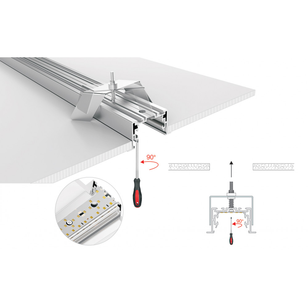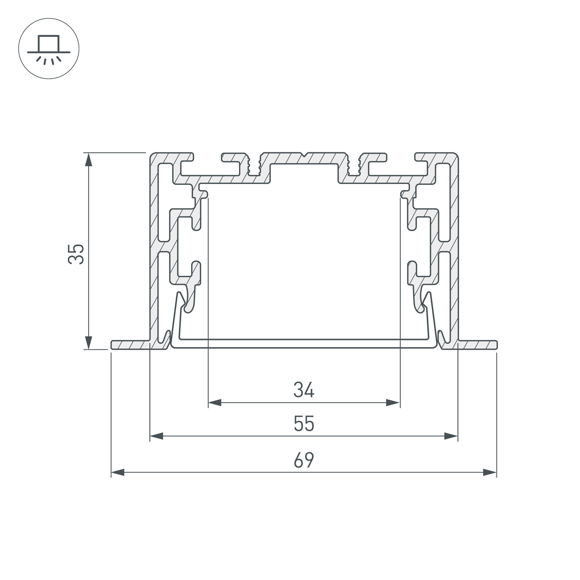 Комплект с экраном. Алюминиевый анодированный профиль для светодиодных лент и линеек. Габаритные размеры (LхWхH): 2500x69x35 мм. В комплекте профиль, PC матовый экран. Ширина площадки для ленты 34 мм. Светопропускание экрана 85%.