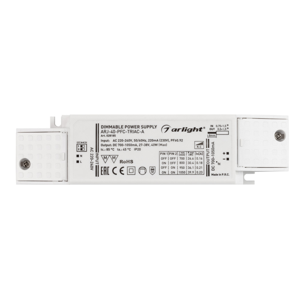 Блок питания ARJ-40-PFC-TRIAC-A (40W, 700-1050mA) 028185, Диммируемый источник тока по стандарту TRIAC с гальванической развязкой для светильников и мощных светодиодов. Входное напряжение 220-240 VAC. Выходные параметры: 27-38 В, 700-1050 mА, 40 Вт. Выбор значения тока осуществляется DIP-переключателем.