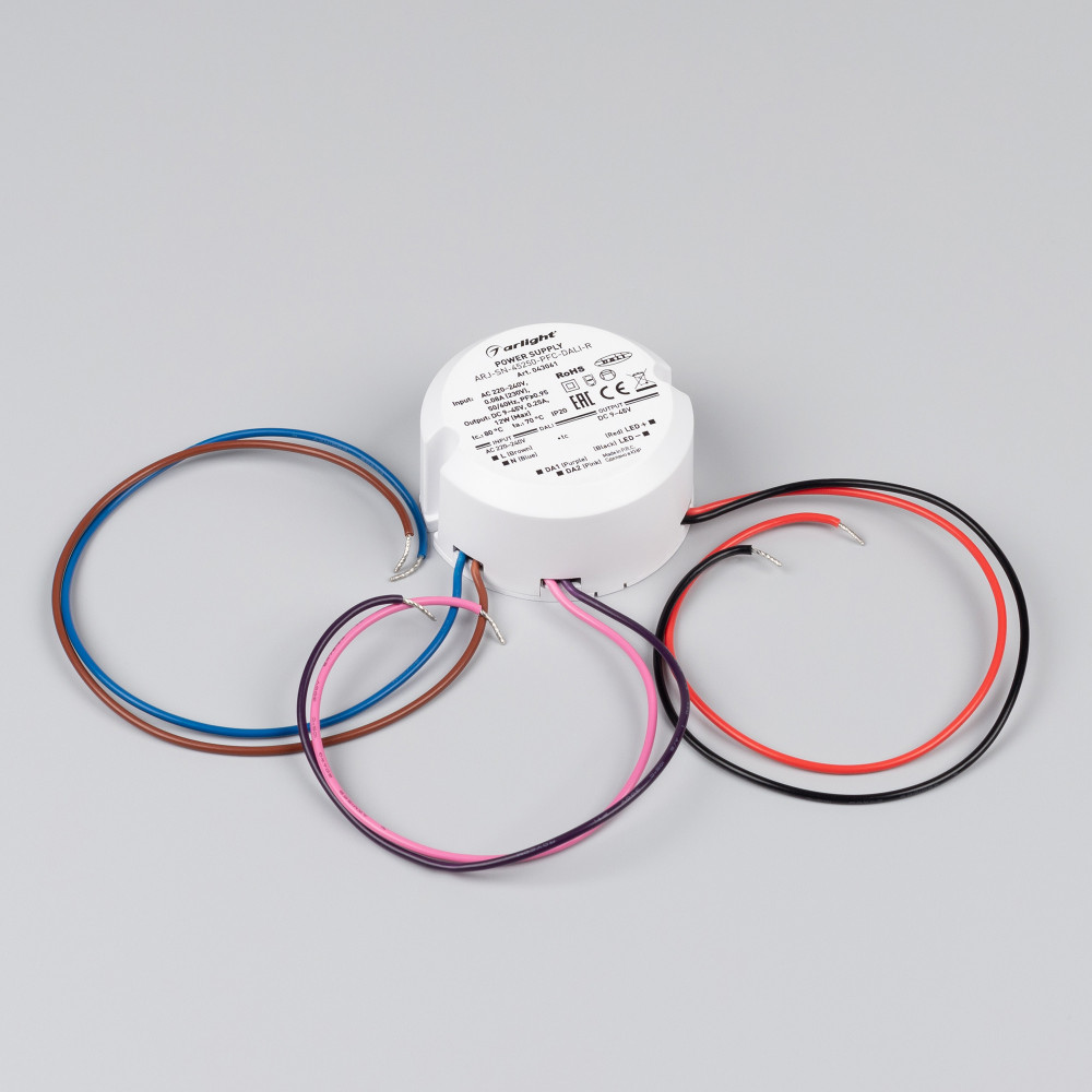 Диммируемый источник тока по протоколу DALI с гальванической развязкой для светильников и мощных светодиодов. Входное напряжение 220-240 VAC. Выходные параметры: 9-45В (250мА), максимальная мощность 12 Вт. Встроенный PFC >0,95.