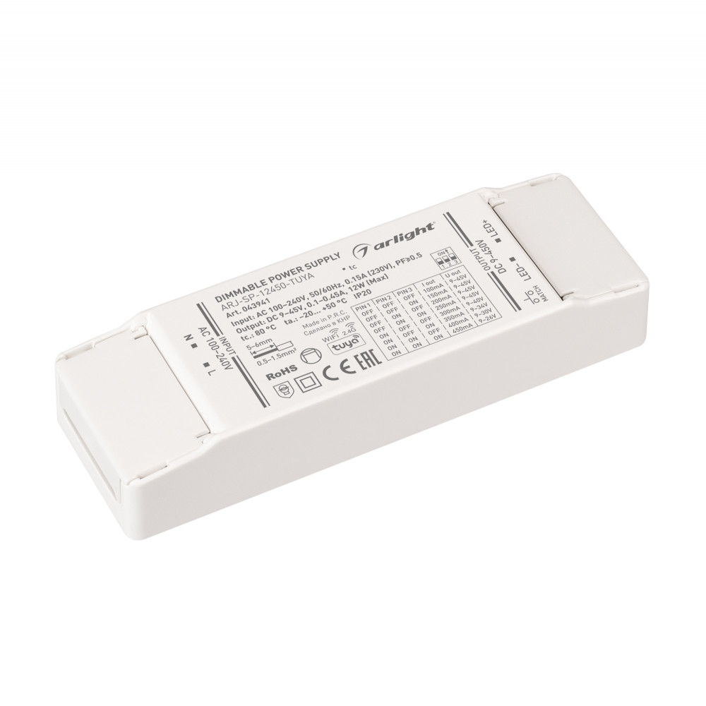 Блок питания ARJ-SP-12450-TUYA (12W, 9-45V, 0.1-0.45A, WiFi, 2.4G) 043941, Диммируемый источник тока одноканальный, для светодиодных светильников. Выбор значения выходного тока осуществляется подстроечным резистором на плате. Входное напряжение 220-240 VAC. Выходные параметры: 9-45В (100мА), 9-45В (150мА), 9-45В (200мА), 9-45В