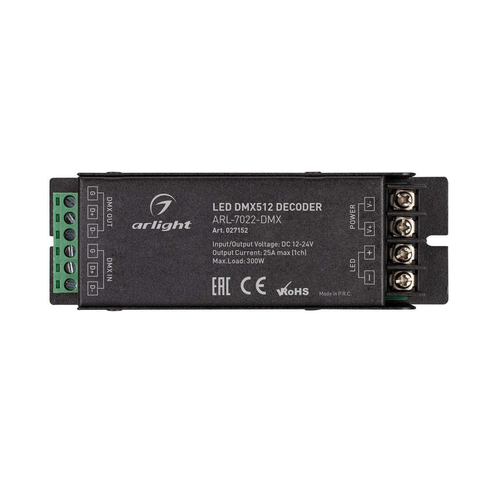 Декодер ARL-7022-DMX (12-24V, 1x25A, DMX512) 027152, Декодер сигнала DMX512 в ШИМ (PWM). Напряжение питания DC 12-24V, 1 канал управления, ток нагрузки до 25А, максимальная мощность 300-600W, винтовые клеммы. Адреса устанавливаются DIP-переключателями на корпусе. Габариты 127х42х33 мм.