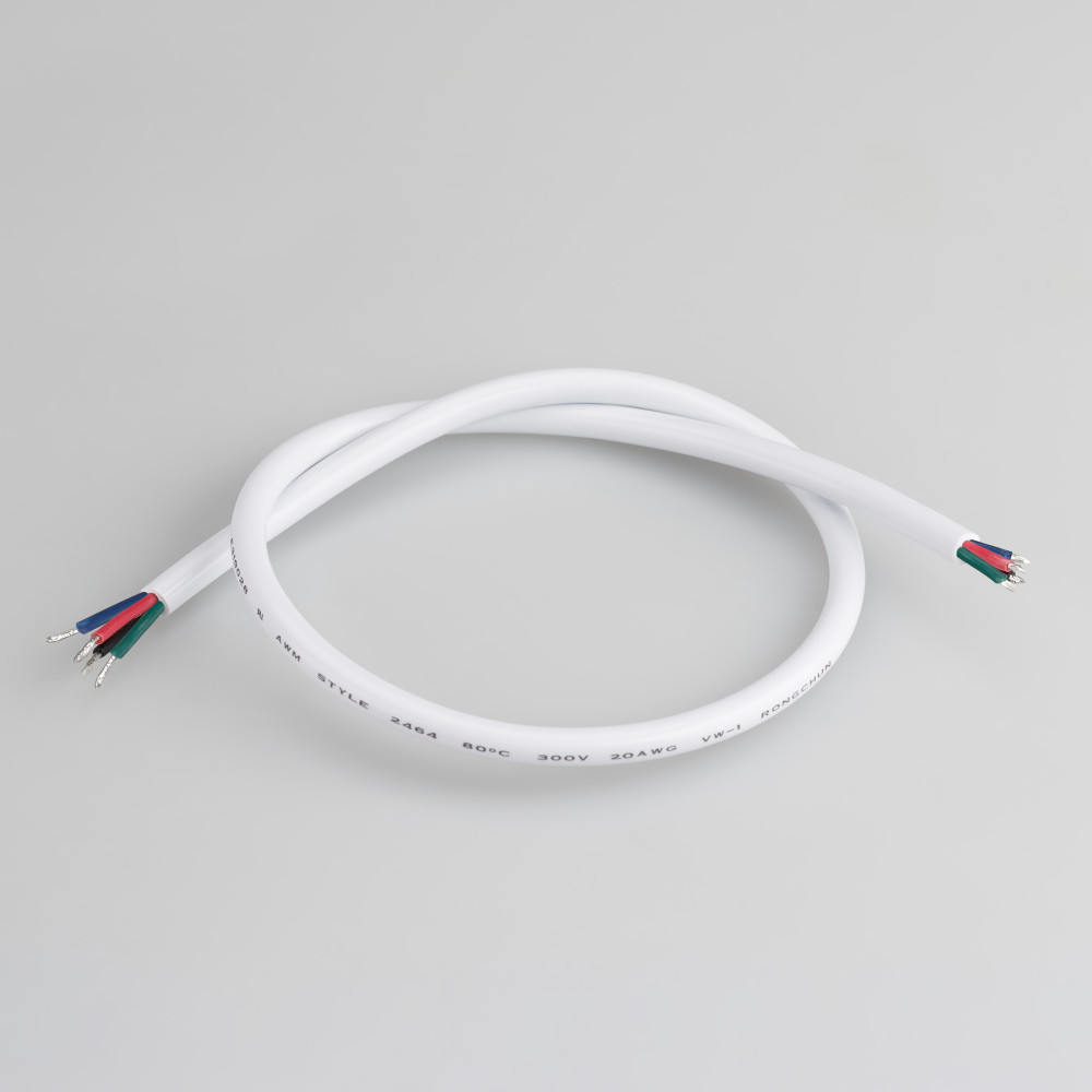 Провод питания для RGB гибкого неона MOONLIGHT 1516. 4 проводника, калибр проводника 20AWG, материал проводника - лужёная медь, внешний диаметр 6 мм. Внешняя оболочка - ПВХ белого цвета. Длина кабеля в отрезке - 500 мм.