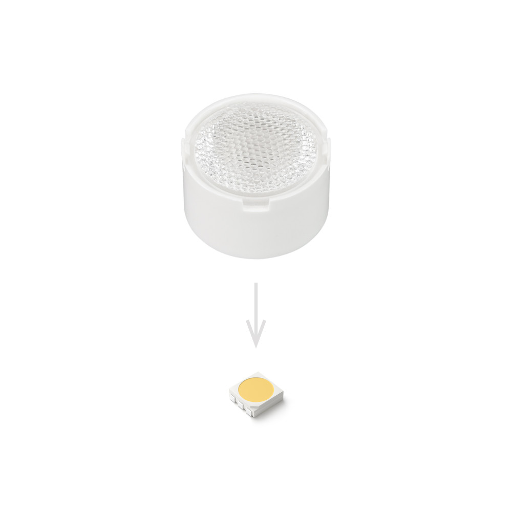 Одиночная линза со съемным холдером белого цвета для светодиодов SMD: 2525, 2835, 3030, 3535, 5050. Угол обзора: вертикальный 45°, прозрачная микропризма. Материал PMMA. Диаметр 19.5 мм, высота 11.76 мм.