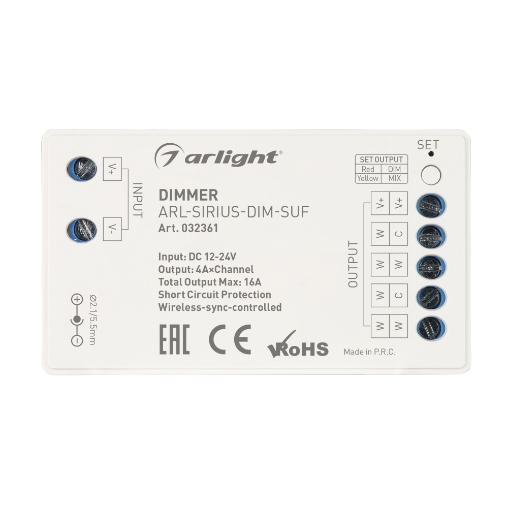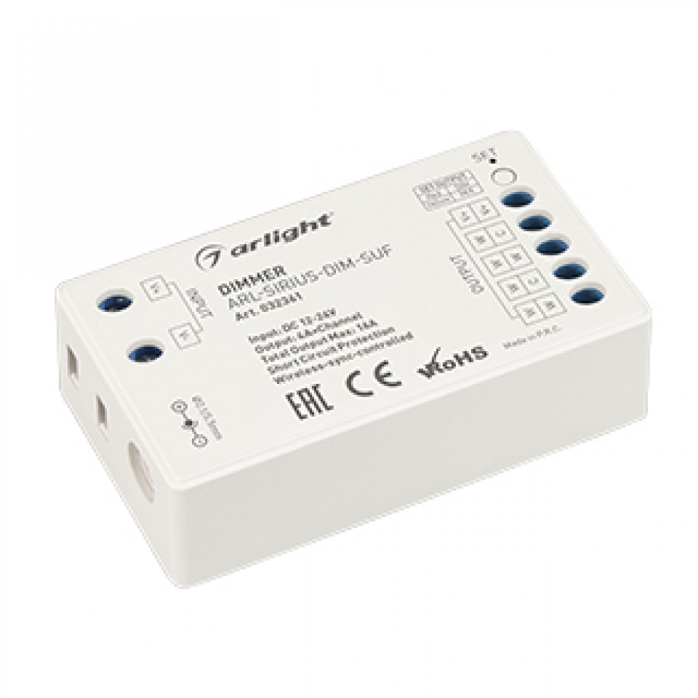 Диммер ARL-SIRIUS-DIM-SUF (12-24V, 4x4A, 2.4G) 032361, Контроллер для светодиодной DIM/MIX/RGB/RGBW ленты (ШИМ). Питание/рабочее напряжение 12-24VDC, максимальный ток 4A на канал, 4 канала, максимальная мощность 192-384W. Винтовые клеммы. Корпус - PVC. Габариты 70х40х20 мм.