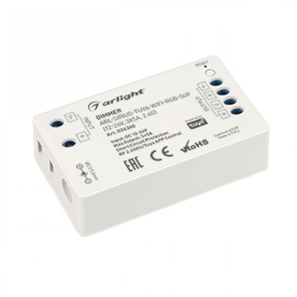 Диммер ARL-SIRIUS-TUYA-WIFI-RGB-SUF (12-24V, 3x5A, 2.4G) 036360, Контроллер трёхканальный для RGB светодиодных лент. Питание/рабочее напряжение 12-24VDC, максимальный ток 5A на канал, 3 канала, максимальная мощность 180-360W. Частота ШИМ 1.95kГц, Wi-Fi 2.4G. Винтовые клеммы. Корпус - PVC. Габариты 70х40х20 мм.