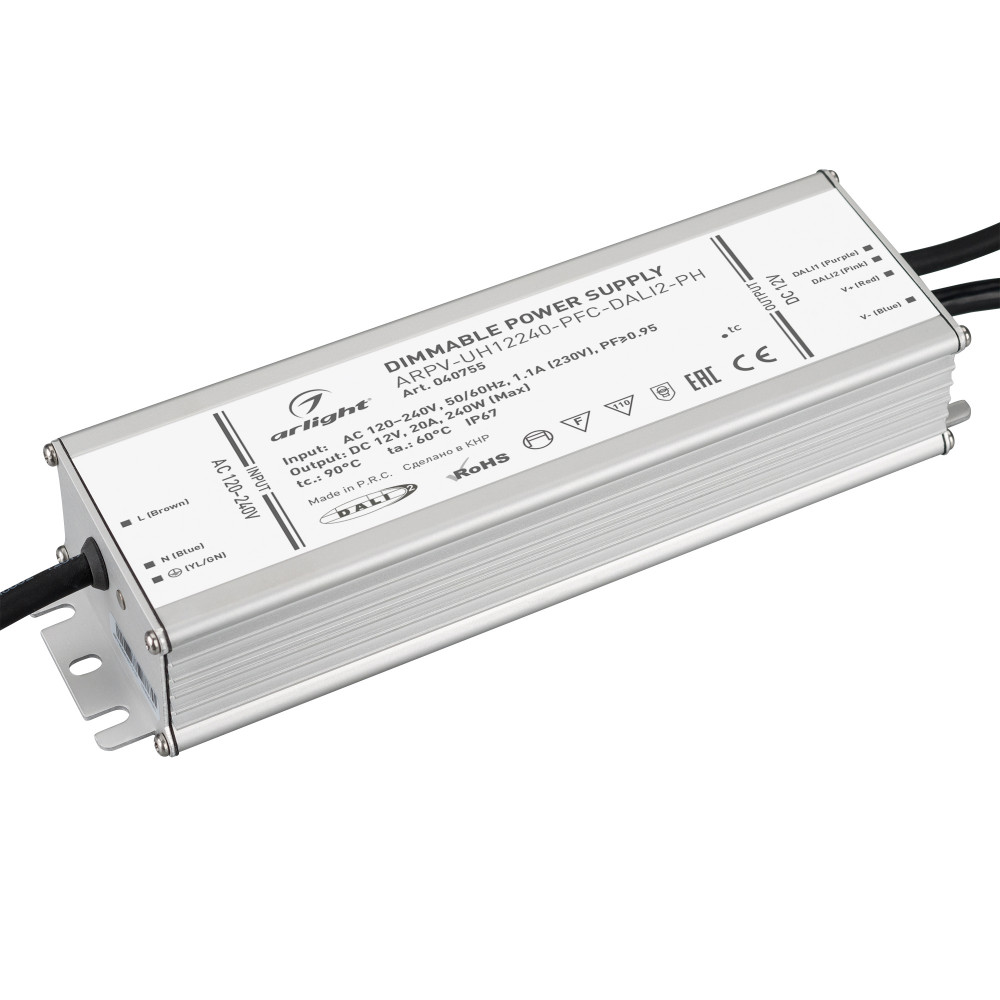 Диммируемый источник напряжения по протоколу DALI2.0 с гальванической развязкой для светодиодных изделий. Входное напряжение 120-240 VAC. Выходные параметры: 12 В, 20 А, 240 Вт. Встроенный PFC >0.95. Герметичный алюминиевый корпус IP 67.