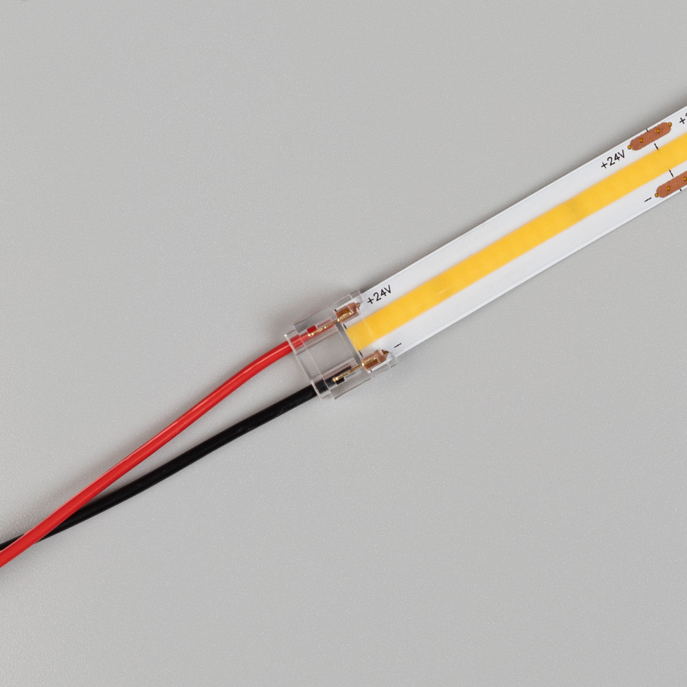 Доставка Коннектор COB-MONO-10mm-2pin-STW 046945 , Одиночный коннектор для соединения 2-х отрезков открытых светодиодных одноцветных лент COB шириной 10 мм. Материал - прозрачный пластик. Обеспечивает соединение без видимых разрывов. Максимальный допустимый ток 3 А, максимальное напряжение 24 В