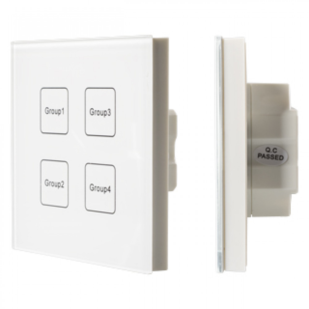 Встраиваемая сенсорная панель с выходом DALI. 4 кнопки, 4 группы. Каждой кнопкой выполняется включение, выключение и диммирование по соответствующей ей группе. Установка стартового номера группы выполняется переключателями на корпусе. Питание от шины DALI