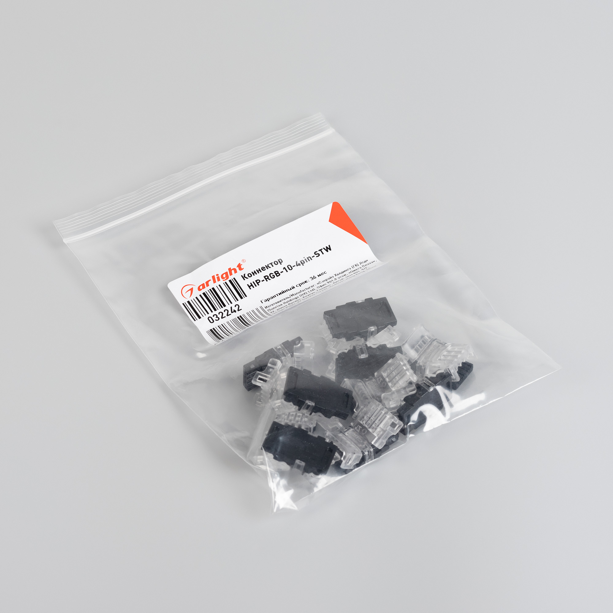 Коннектор HIP-RGB-10-4pin-STW 032242, Одиночный коннектор (без провода) для подключения питания к открытым RGB лентам шириной 10 мм. Очистка провода питания (0,5-1,0 мм2) от изоляции не требуется. Материал - прозрачный пластик. Максимальный допустимый ток 3 А, напряжение 3-24 В