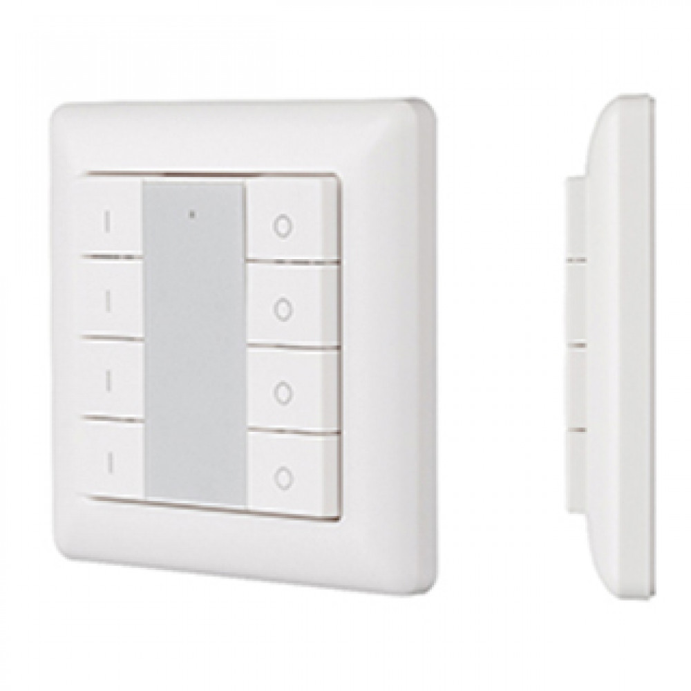 4-зонный накладной диммер-выключатель, работает по радиоканалу (короткое нажатие - вкл, длинное нажатие - диммир-е). Используется с контроллерами серии SR-1009х. Питание - литиевая батарейка 3V CR2450. К одному контроллеру SR-1009х можно привязать неск. п
