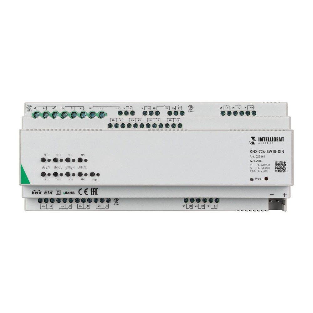 Доставка KNX-724-SW10-DIN , Релейный модуль 24-ти канальный для KNX систем. Установка на DIN рейку. Возможно использование как простого релейного модуля, так и в качестве контроллера штор/жалюзи. Возможность ручного управления. Напряжение питания DC 21-30V от шины данных.