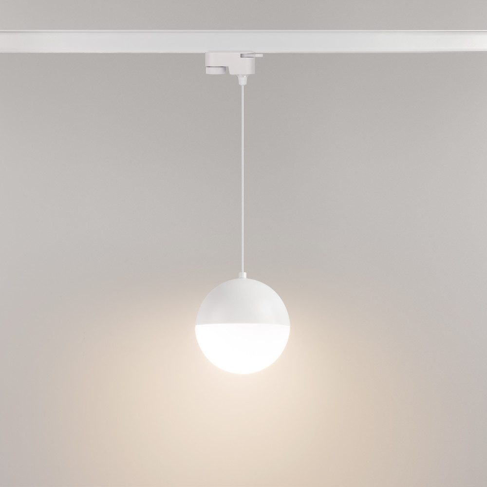 Светильник подвесной для треков/шин 2 провода. Мощность 11 Вт, св. поток 960 лм, 80 лм/Вт, теплый 3000 K, CRI>90, угол 170°, напряжение питания 230 В. Белый корпус из алюминия, материал плафона стекло, степень защиты IP20.