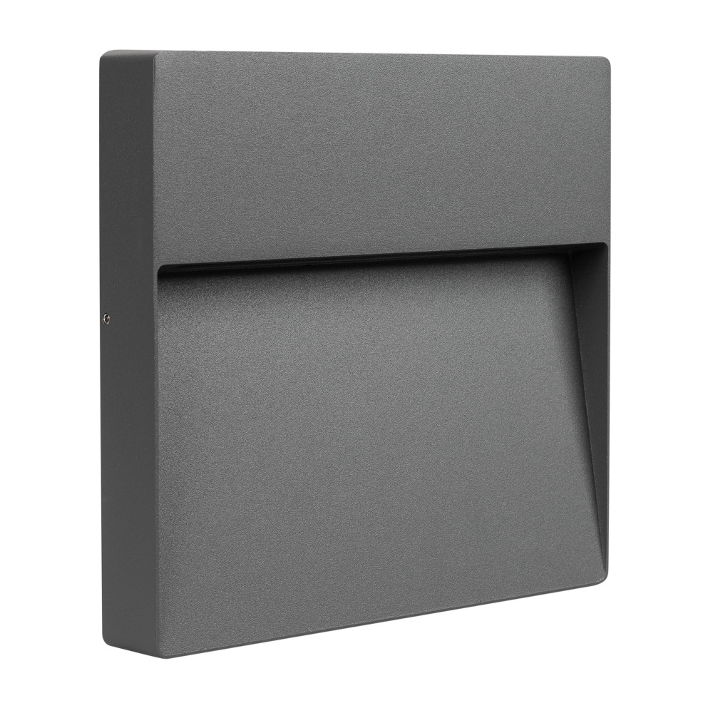 Светодиодный накладной квадратный светильник для стен, лестниц, 8Вт. Цвет ТЕПЛЫЙ БЕЛЫЙ 3000K, св.поток 300лм, CRI(Ra)>80, угол 60°, асимметричный свет. Размер 215x215x36мм. Влагозащищенный корпус IP65, алюминий серого цвета. Питание AC230V, 8Вт,