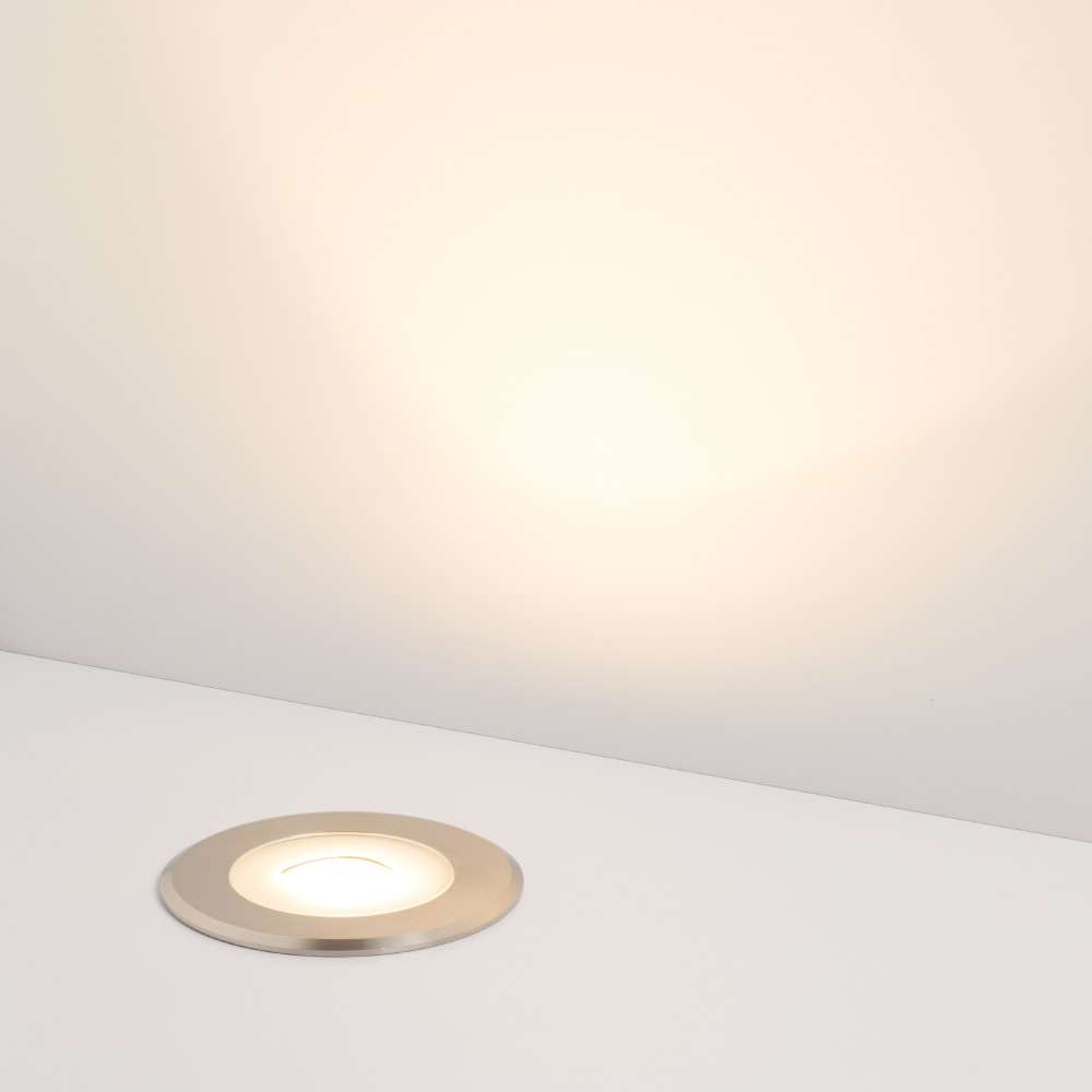 Встраиваемый светодиодный светильник для грунта и пола. Мощность 9Вт, световой поток 490лм, цвет ТЕПЛЫЙ 3000К. CRI(Ra)>80, угол 60° асимметричный, наклон луча 30°. Круглый влагозащищенный корпус IP67, нержавеющая сталь. Экран закалённое стекло.