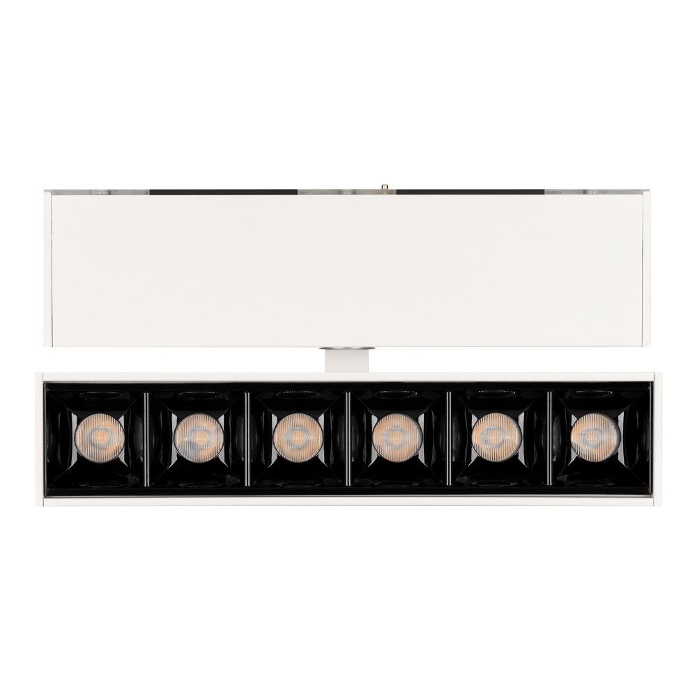 Светильник поворотный для магнитных треков шириной 45мм, 6Вт. Цвет свечения ТЕПЛЫЙ 3000K, световой поток 400лм, угол 15°, CRI>90. Корпус прямоугольный, металл, цвет белый, IP20. Размеры LxWxH 163x35x92.5мм. Входное напряжение DC24V, мощность 6Вт. Драйвер