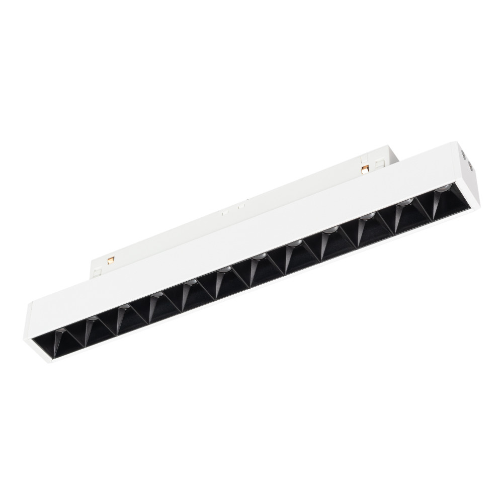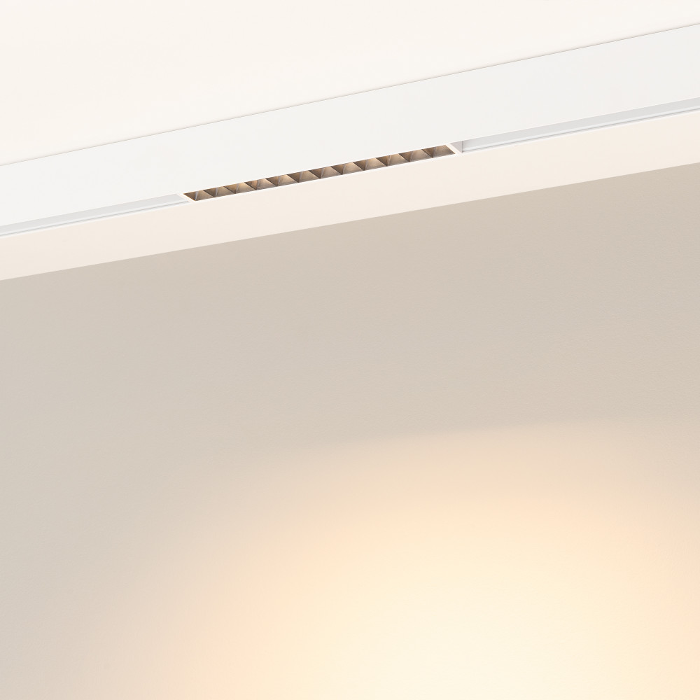Светильник для магнитных треков MAG-ORIENT шириной 26 мм. Мощность 8 Вт, св. поток 440 лм, 55 лм/Вт, теплый 3000 K, CRI>90, угол24°, напряжение питания 48 В. Белый прямоугольный корпус из металл, экран поликарбонат, степень защиты IP20. Размер: длина 235