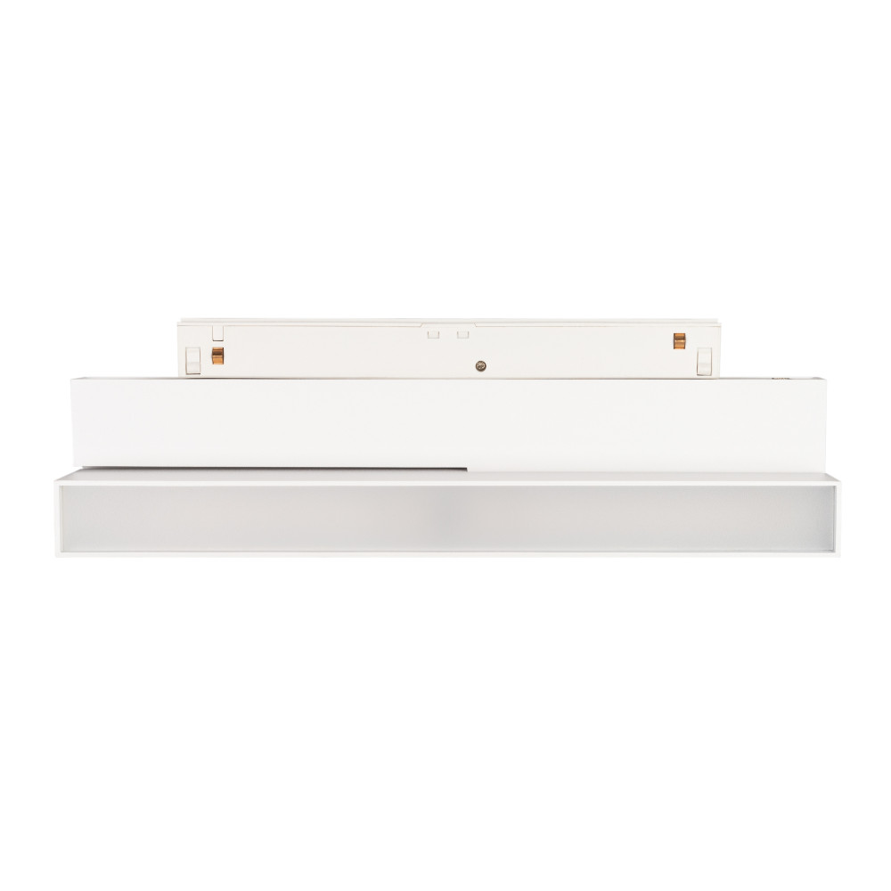 Светильник для магнитных треков MAG-ORIENT шириной 26 мм. Мощность 12 Вт, св. поток 750 лм, 60 лм/Вт, теплый 3000 K, CRI>90, угол 80°, напряжение питания 48 В. Белый прямоугольный корпус из металл, экран поликарбонат, степень защиты IP20. Размер: длина 23