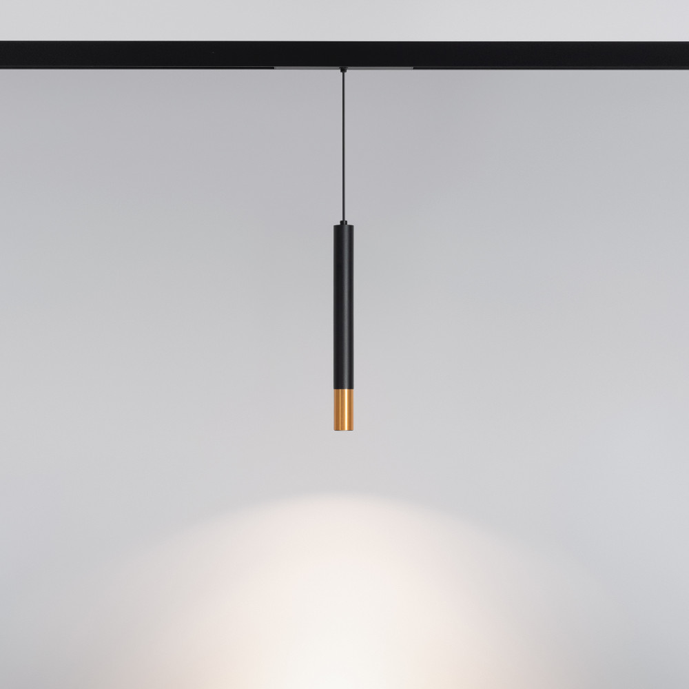 Светильник подвесной для магнитных треков шириной 25мм, 5Вт. Цвет свечения ДНЕВНОЙ 4000K, световой поток 300лм, угол 45°, CRI>90. Корпус цилиндрический, металл, цвет черный с золотой вставкой, IP20. Размер светового модуля 30*300 мм; размер установочного