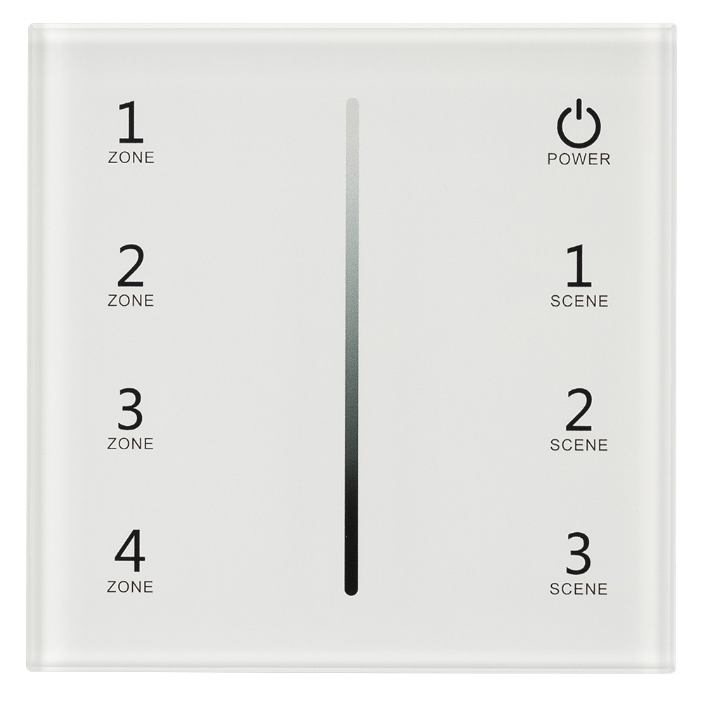 Встраиваемая сенсорная стеклянная панель 2.4 ГГц, цвет белый. Для управления яркостью с помощью сенсорной полосы. Питание/рабочее напряжение AC 85-265V, 4 зоны управления, память 4 сцен. Функция управления DMX512 устройствами. Габариты 86х86х36 мм. Панель