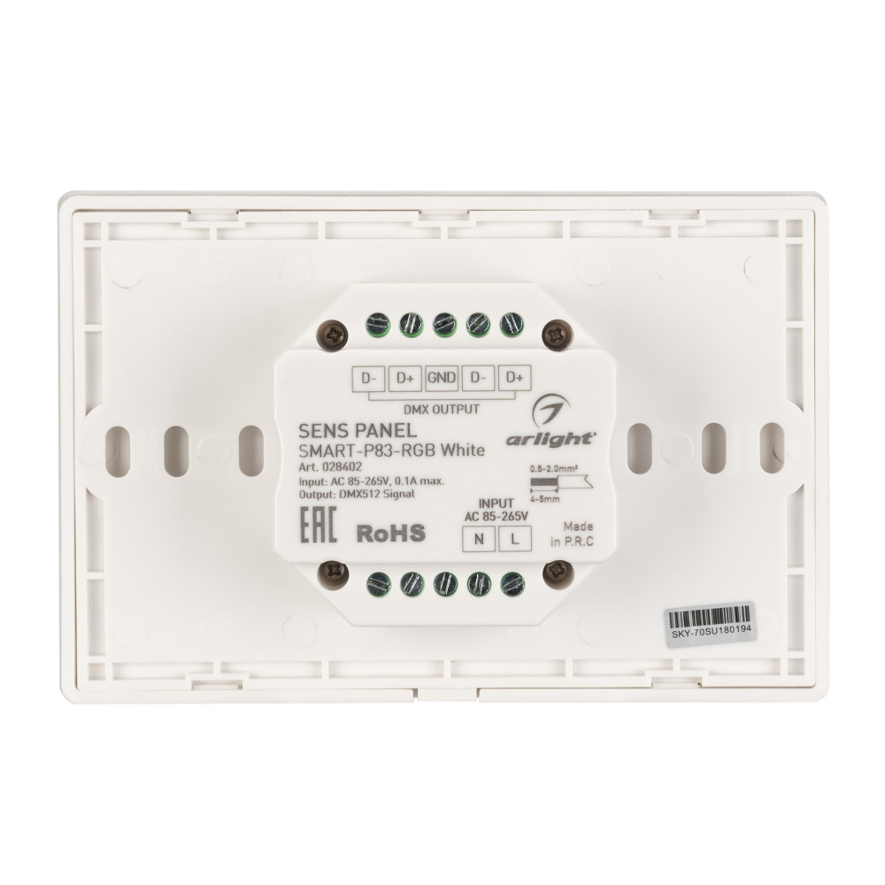 Панель Sens SMART-P83-RGB White (230V, 4 зоны, 2.4G) 028402, Встраиваемая сенсорная панель 2.4 ГГц, цвет белый. Итальянский стандарт. Материал - стекло. Для управления RGB источниками света (ШИМ), 4 зоны управления. Функция управления DMX512 устройствами. Питание/рабочее напряжение AC 85-265V. Габариты 120х80х37 мм