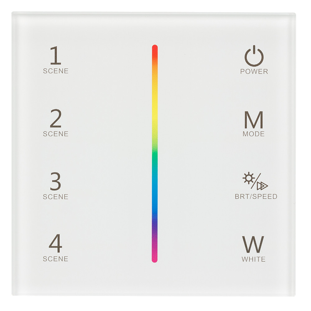 Встраиваемая сенсорная стеклянная панель 2.4 ГГц, цвет белый. Для управления светодиодными RGBW источниками света (ШИМ). Управление цветом с помощью сенсорной полосы. Работает в режиме master/slave и может выполнять функцию независимого контроллера. Питан