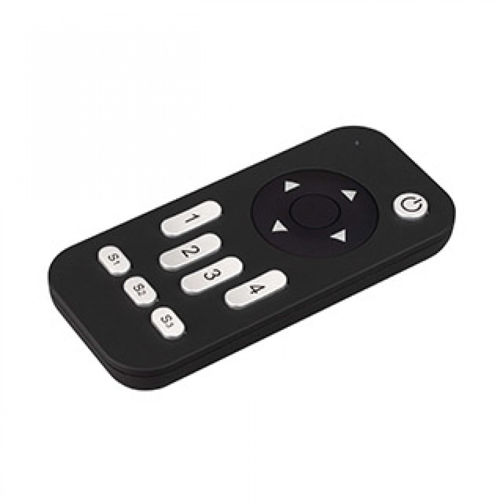 Кнопочный радиопульт 2.4 ГГц черного цвета для управления одноцветным (DIM) источником света. 4 зоны управления, 3 сцены, управление яркостью с помощью кнопок. Питание 3VDC (AAAx2). Габариты 115x53x18 мм. Изготовлен из пластика с покрытием Soft Touch. Упр