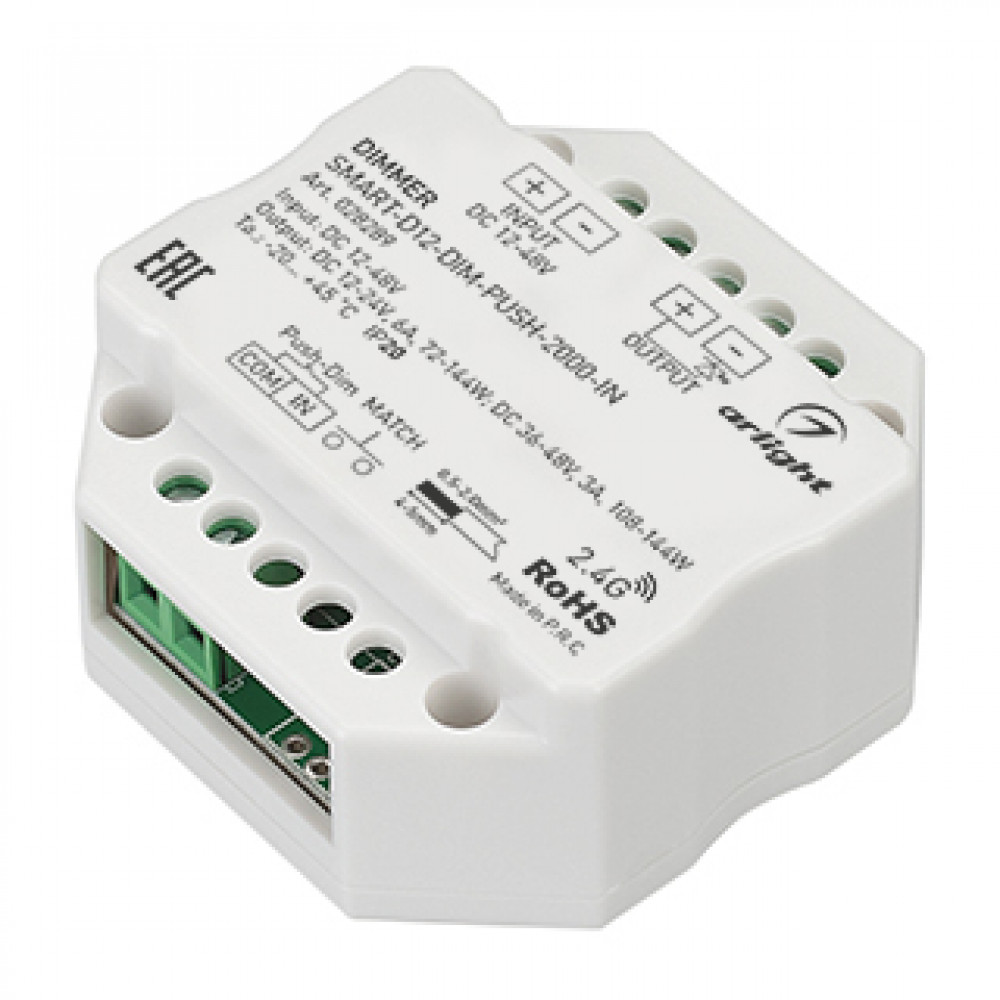 Диммер SMART-D12-DIM-PUSH-2000-IN (12-48V, 1x6A, 2.4G) 028289, Диммер для монохромной светодиодной ленты (ШИМ) с функцией Push-Dim. Питание/рабочее напряжение 12-24VDC, максимальный ток 6A на канал при напряжении (DC12-24V) и 3А на канал при напряжении (DC36-48V), 1 канал. Максимальная мощность для 12-24V - 72-144W,
